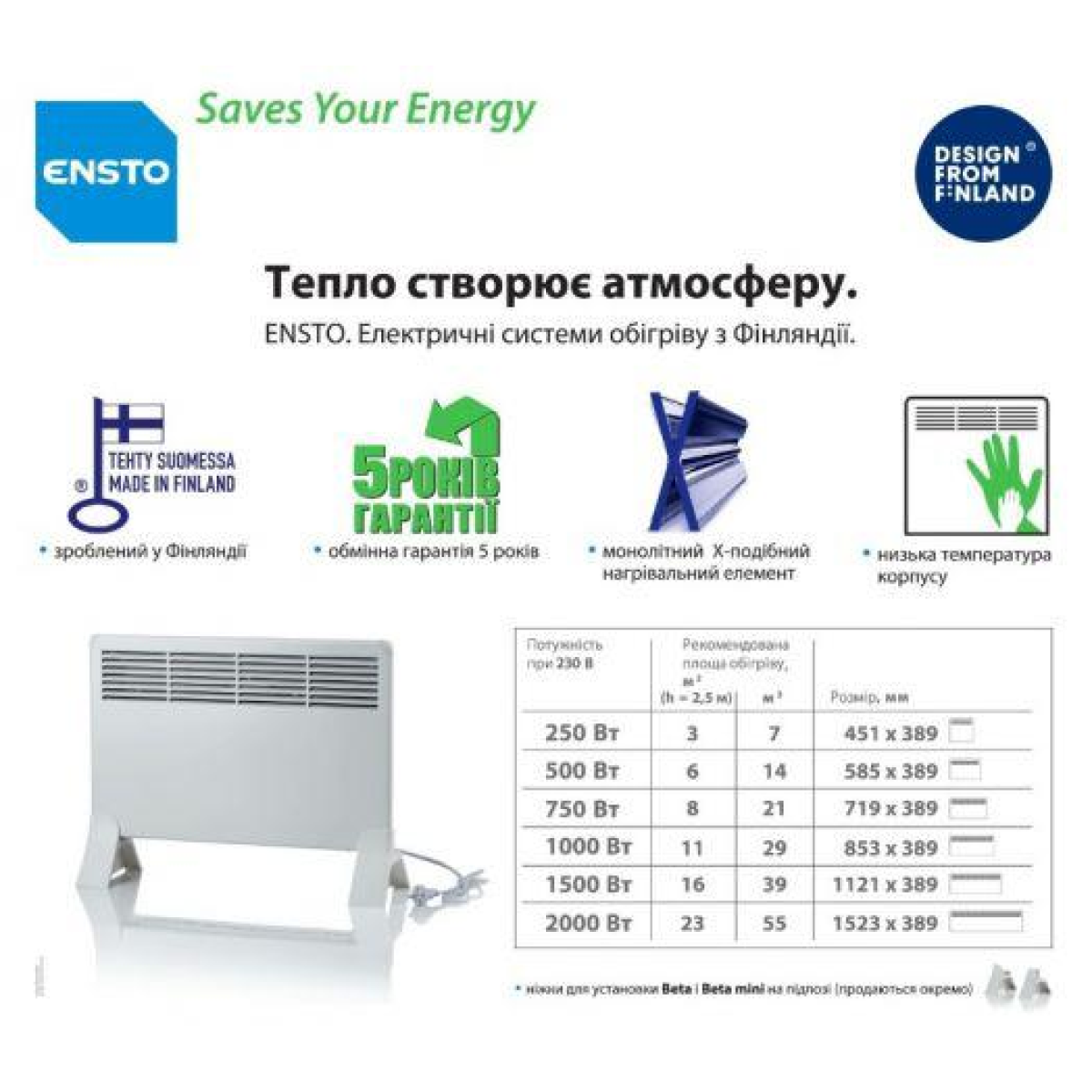 Практичність електроконвекторів Ensto полягає в тому, що практично вся електроенергія перетворюється на тепло, тому комфортний рівень температури досягається швидко.